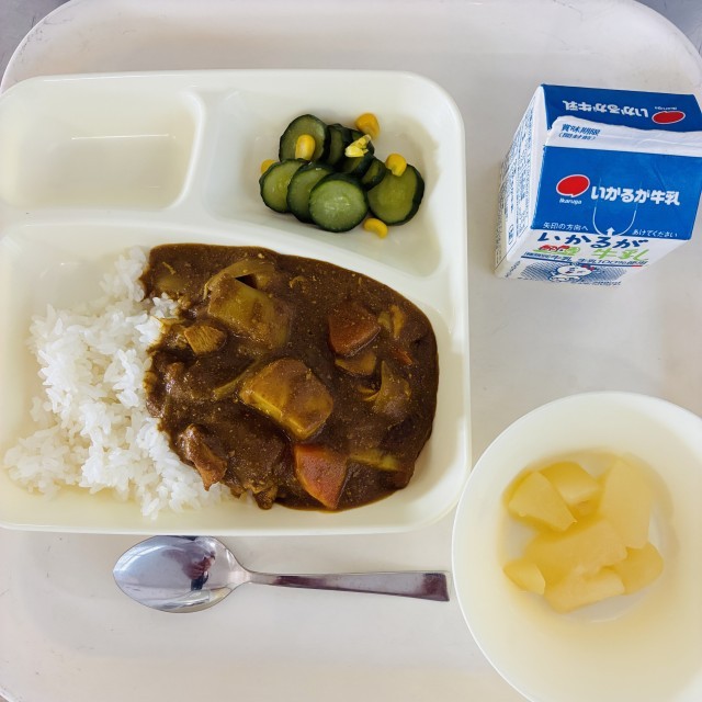 今日の献立は、牛乳、チキンレバーカレーライス、きゅうりとコーンのサラダ、洋梨(カット缶)でした。