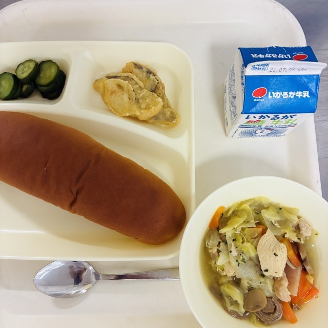 今日の献立は、黒糖パン、牛乳、白身魚フリッター、スープ煮、きゅうりのピクルスでした。