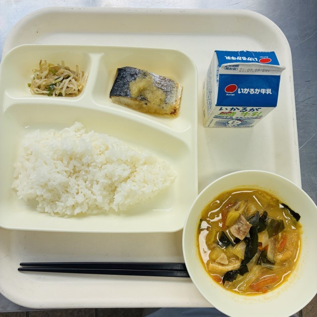 今日の献立は、ご飯、牛乳、さごしのおろしじょうゆかけ、みそ汁、もやしとピーマンの炒めものでした。