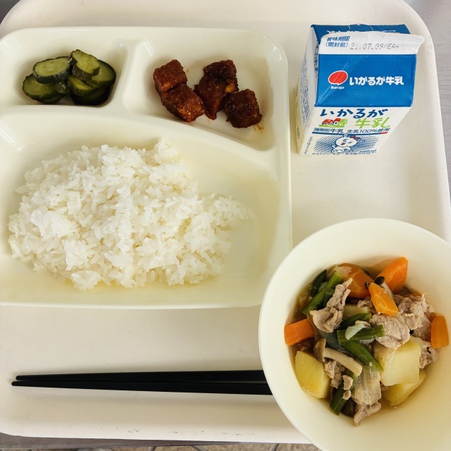 今日の献立は、ご飯、牛乳、まぐろのオーロラ煮、豚肉と野菜の煮もの、きゅうりのゆず風味でした。