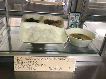 豚肉のおろし醤油かけ、味噌汁、じゃこピーマン、ご飯、牛乳