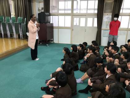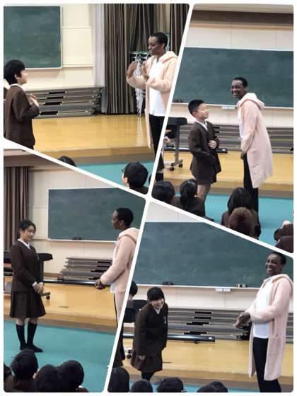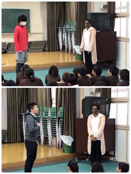 テニー先生の自己紹介を聞いた後、各クラスの学級代表と各学級担任、今年6年生に関わっていただける釜谷先生が英語でテニー先生に自己紹介をしました。