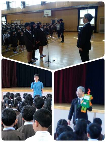 まず、校長先生から大和田小学校PTA のマスコット、グローバーの紹介や今週木曜日に予定されている6年生の全国学力学習状況調査、金曜日に予定されている学習参観懇談会についてお話していただきました。