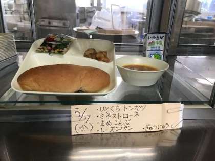 一口トンカツ、ミネストローネ、豆昆布、レーズンパン、牛乳