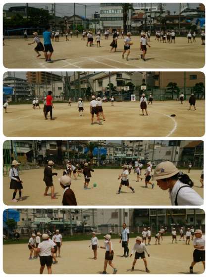 顔を真っ赤にしながら、ドッジボールをしたり、一輪車や竹馬に乗ったりと、子どもたちは元気に遊んでいます。先生方も一緒に体を動かしています!!
