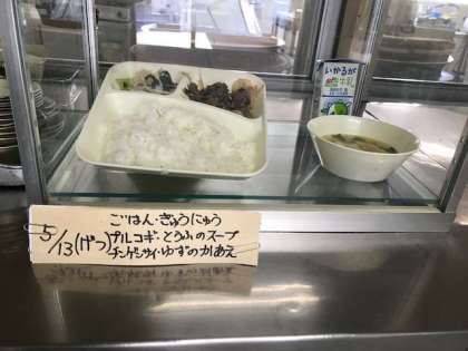 プルコギ、豆腐のスープ、チンゲンサイ柚子の香あえ、ご飯、牛乳