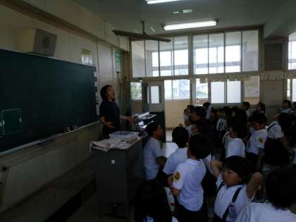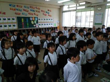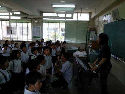 5時間目に1年生は学年合同で音楽の学習をしました。