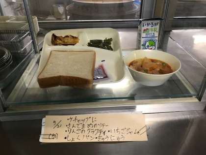 ケチャップ煮、三度豆のソテー、りんごのクラフティ、食パン、牛乳