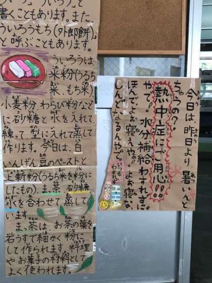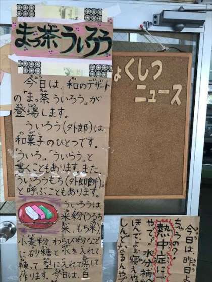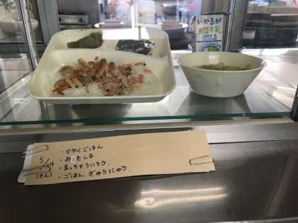 かやくご飯、味噌汁、抹茶ういろう、牛乳
