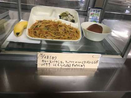 です。カレースパゲッティにバナナ、子どもたちが好きな献立です。しっかり食べて体調を整えましょう!