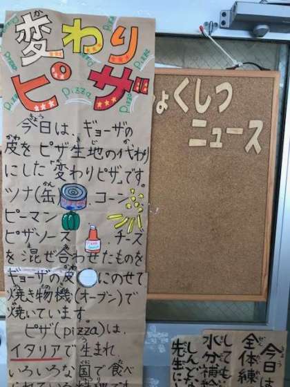 です。餃子の皮でつくられているかわりピザは、子どもたちが、大好きなメニューの一つです。
