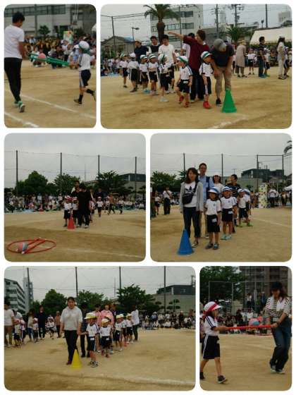 1年生の親子競技「親子ではこぼう!ボールはこびレース」の様子です。