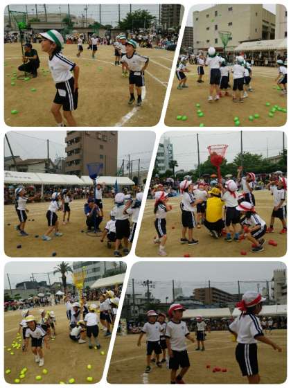 力を合わせてかごに玉を投げ入れ、曲が止まると次の曲に合わせ可愛くダンスしました。
