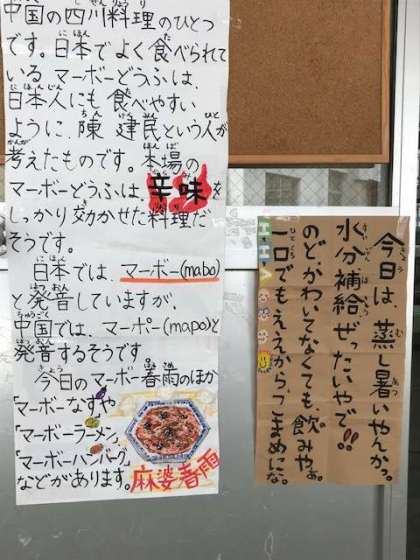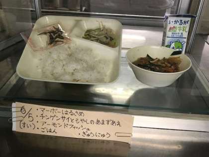麻婆春雨、チンゲンサイともやしの甘酢和え、アーモンドフィッシュ、ご飯、牛乳