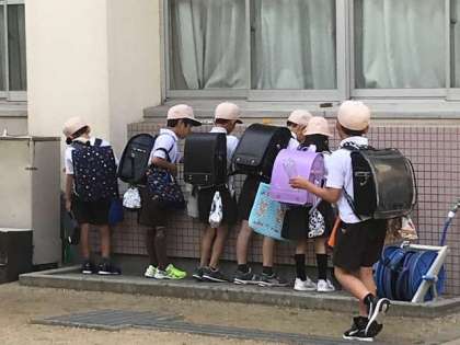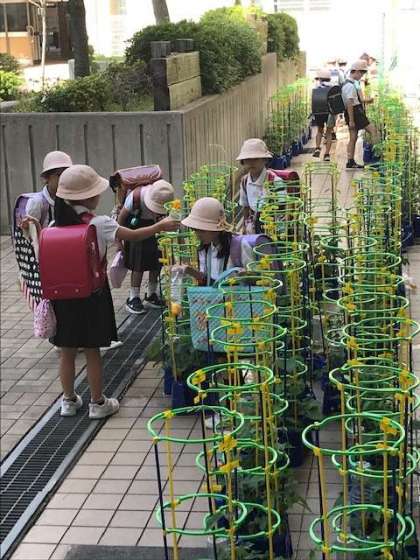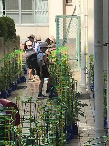中庭での光景です。1年生は朝顔、2年生はトマトに、しっかり水やりをしています。