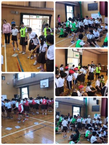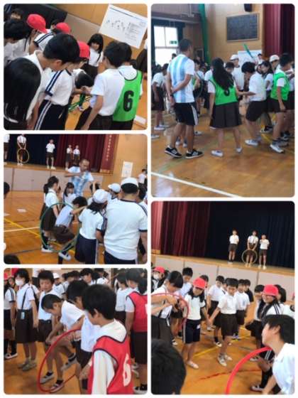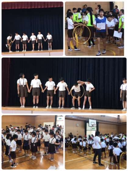 今日の集会は、班別対抗フラフープくぐりでした。1年生から6年生まで、手をつなぎ、しっかり協力して頑張っていました。