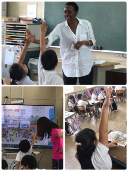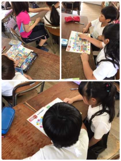 C-NETの先生と、アルファベットの学習をしました。イラストの中から指定された文字を探したり、指差したり、発音したりして、楽しく文字を覚えていました。