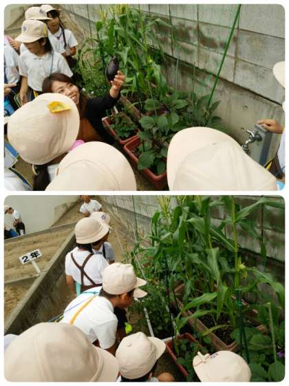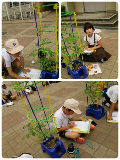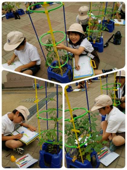 午後から2年1組は学習園と中庭に出て、生活科で育てている、なす、きゅうり、とうもろこしなどを観察したり、ミニトマトの絵をスケッチしたりしました。