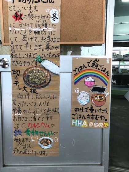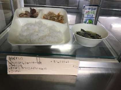 鶏肉の醤油バター焼き、五目汁、切り干し大根の炒め煮、ご飯、牛乳