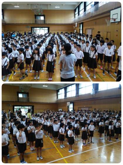 梅雨入りし、雨続きの週始め月曜日の児童朝会です。