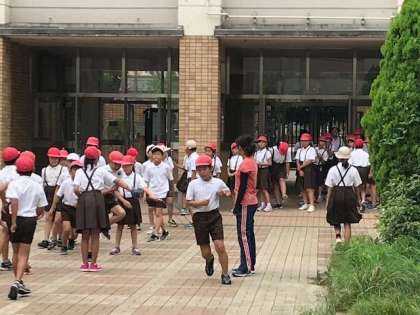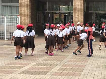 4年2組が中庭で、8の字跳びを頑張っていました。いい記録が出るよう、クラス全員で心を合わせて頑張っています。