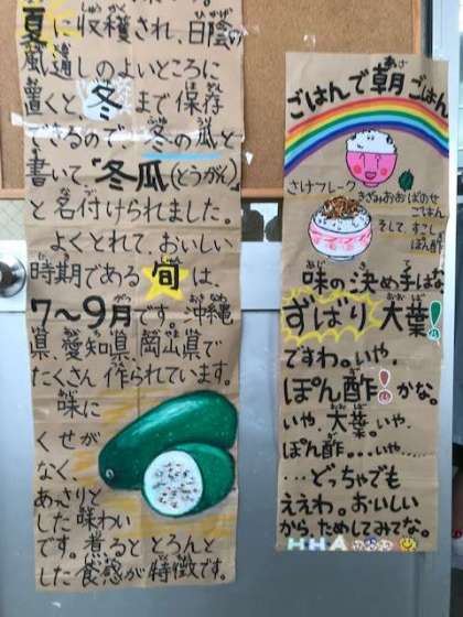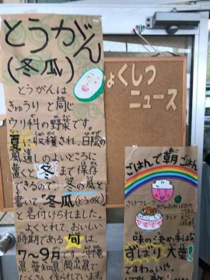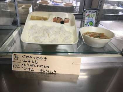 鮭のつけやき、味噌汁、冬瓜の煮物、ご飯、牛乳