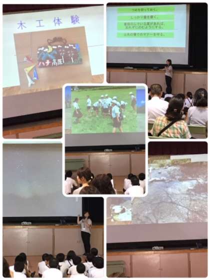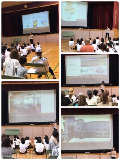 3時間目、講堂で、子どもと保護者と一緒に、林間学習説明会を行いました。