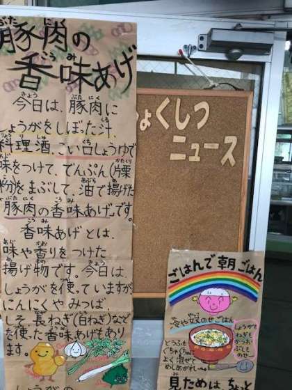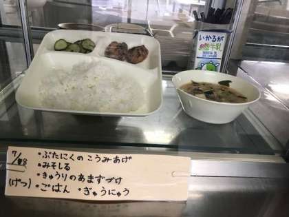 豚肉の香味あげ、味噌汁、きゅうりの甘酢漬け、ご飯、牛乳