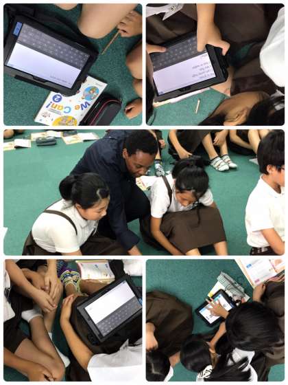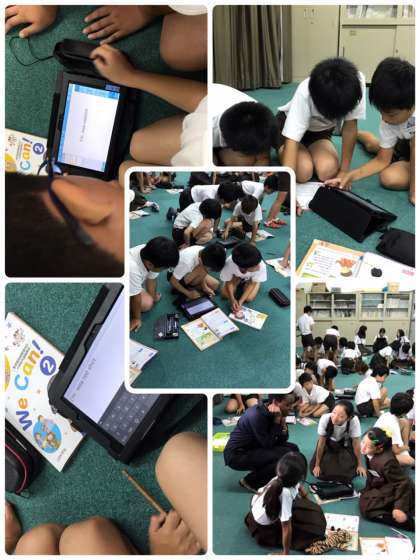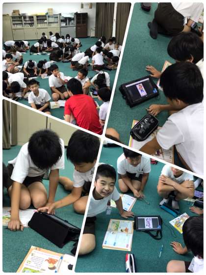 来週の交流に向けて各グループが様々な工夫をしています。タブレット端末に英文を入力することも行なっていました。どのようなクイズができあがるのでしょうか?