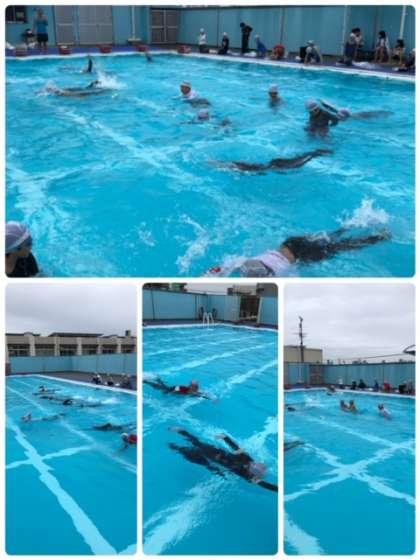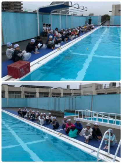今日は5年生で着衣水泳の授業がありました。合言葉は浮いて待て。身近な物を使って緊急時の対処法を学習しました。