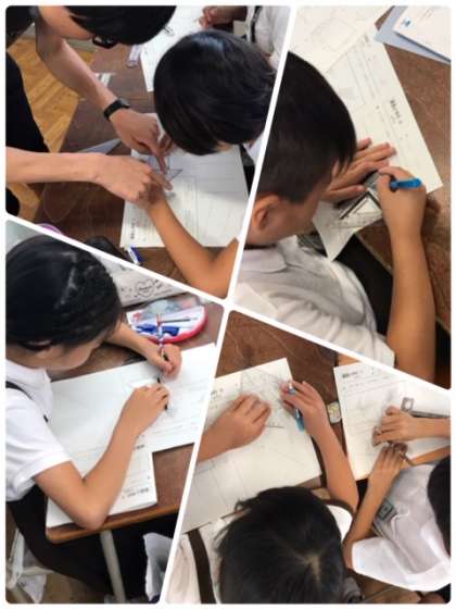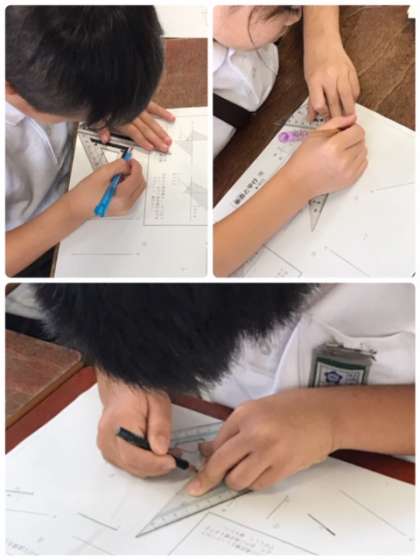 実際に三角定規を使って、垂直や平行の線を書こうと頑張っていました。プリントを回して書いている子、身体をひねって書いている子、など、作図に頑張っていました。