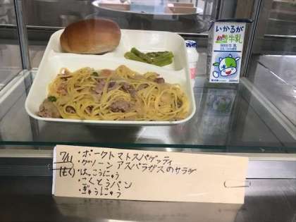ポークトマトスパゲティ、グリーンアスパラガスのサラダ、発酵乳、黒糖パン、牛乳