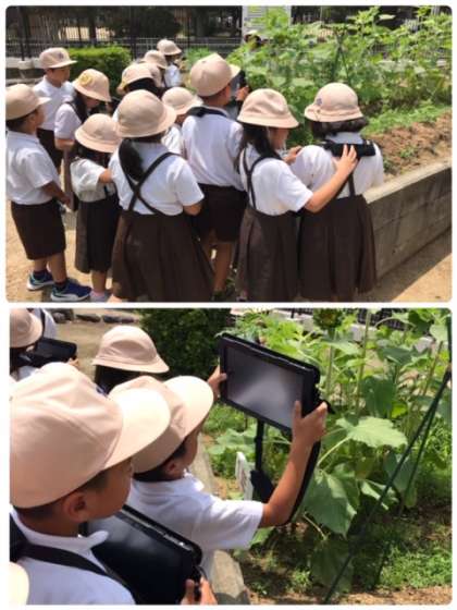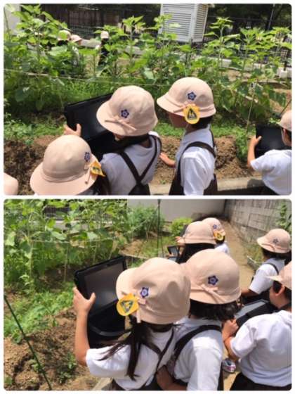学習園の観察にきていました。タブレットで写真をとり記録しています。1年生でもしっかりタブレットを活用しています。子どもは使えば使うほど操作を学んでいきます。