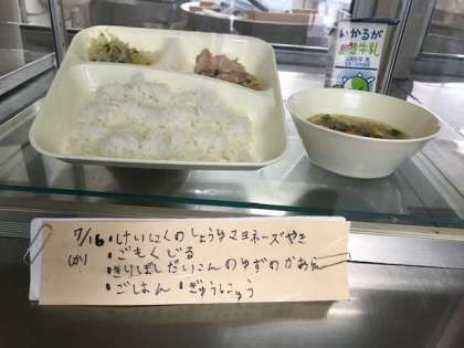 鶏肉の醤油マヨネーズ焼き、五目汁、切り干し大根の柚子の香あえ、ご飯、牛乳