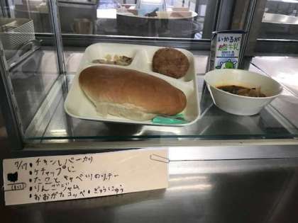 チキンレバーカツ、ケチャップ煮、蛸とキャベツのソテー、りんごジャム、大型コッペ、牛乳