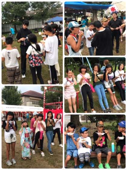みんなで大野百島盆踊りに向かいます。夕食としてカレーをご馳走になり、他のブースでも色々と楽しませていただきました。