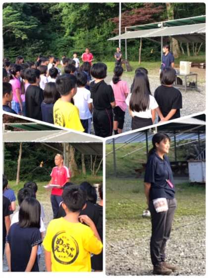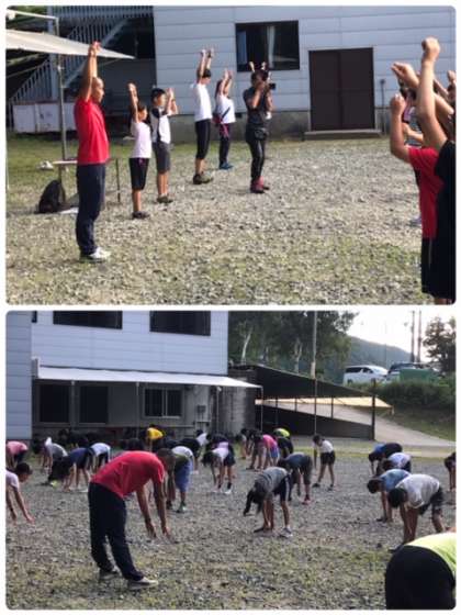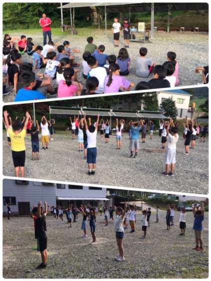 ラジオ体操をして、今日の連絡を受けています。みんなよく寝て、朝から元気です。