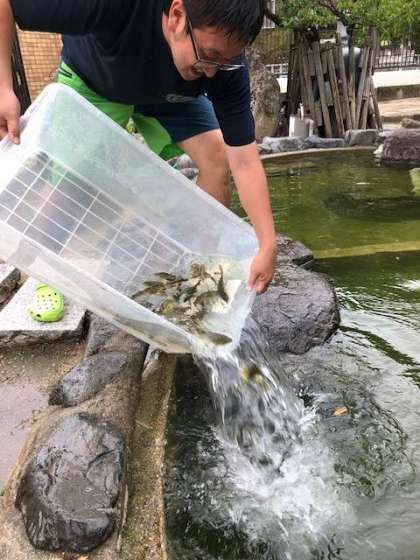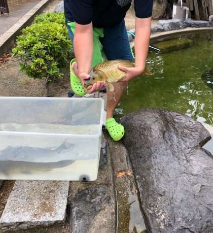 淀中学校の校舎建て替えにともなって、淀中学校の池で飼われていた鯉が、大和田小学校の池にやってきました。大小合わせて100匹近い数です。少々狭そうですが、以前からいる金魚と仲良くしてほしいと願っています。