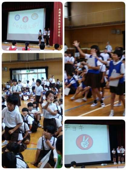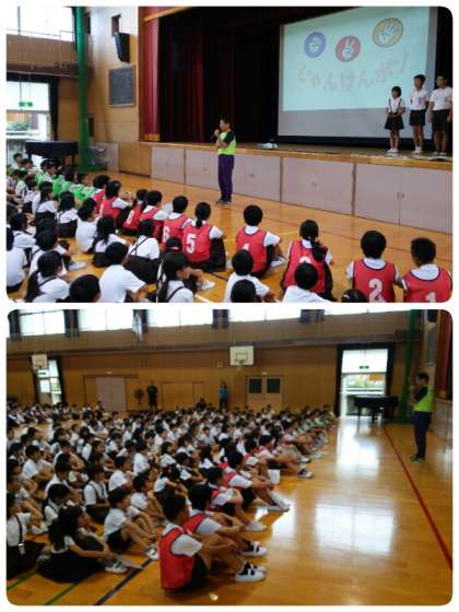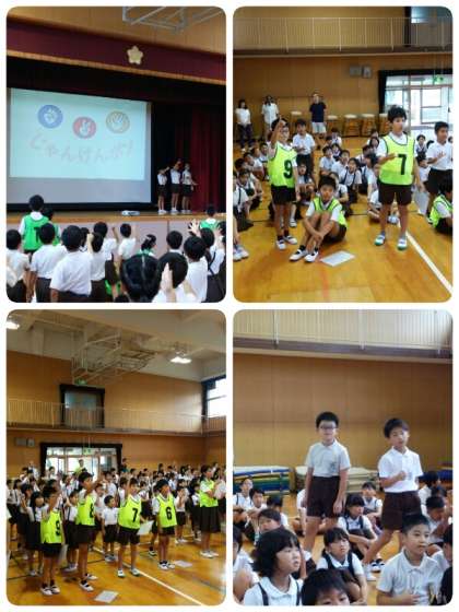 集会委員会の児童と全校児童がじゃんけん対決をしました。最後まで勝ち残った児童が一番多かったのは緑組でした。