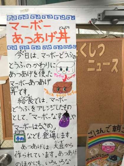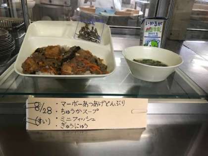 マーボー厚揚げどんぶり、中華スープ、ミニフィッシュ、牛乳