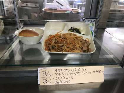 イタリアンスパゲティ、グリーンアスパラガスとキャベツのサラダ、黒糖ロール、牛乳