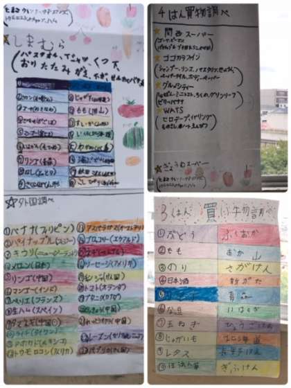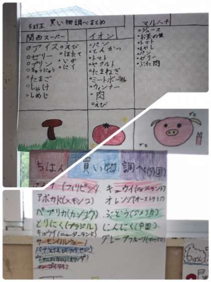 3年生の廊下には、班ごとの買い物調べの結果が貼られています。社会科の学習で調べているようです。近々関西スーパーへ見学にも行く予定にしています。