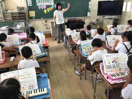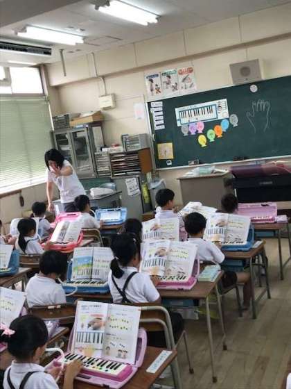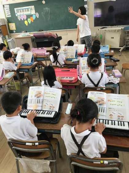 鍵盤ハーモニカの指使いの学習をしていました。まずは、ド、レ、ミの3音を中心に指使いを気にしながら、練習しています。先生の言われる階名を聞いて指を動かし音を出しています。慣れるまで何度も繰り返し練習していきましょう。