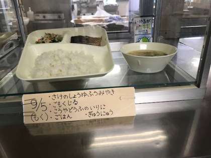 鮭の醤油風味焼き、五目汁、高野豆腐の炒り煮、ご飯、牛乳