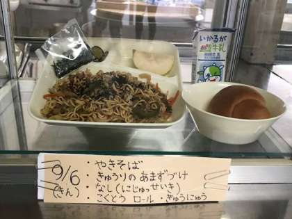 焼きそば、きゅうりの甘酢漬け、梨、黒糖ロール、牛乳