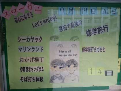 「初心にもどる Let 's enjoy ! 最初で最後の修学旅行」のスローガンのもと、今まで同様みんなで協力し、本番に向けてしっかりと準備し、最高の思い出を作ってほしいと思います。