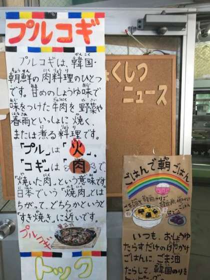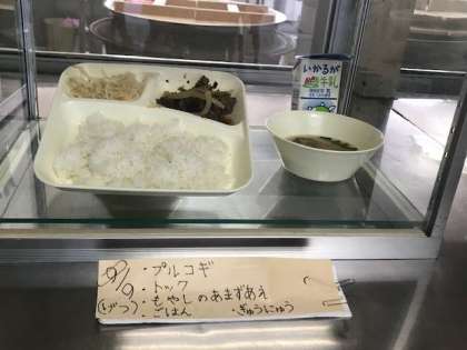 プルコギ、トック、もやしの甘酢和え、ご飯、牛乳