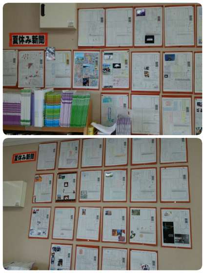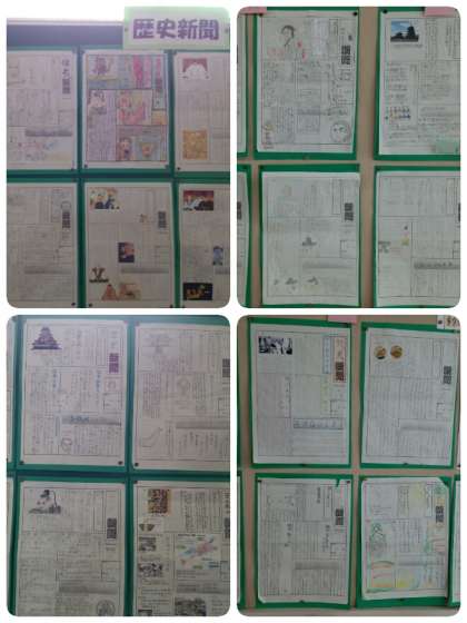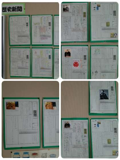 教室や階段の掲示板には夏休みの思い出を記事にした夏休み新聞と社会科で学習したことをまとめた歴史新聞が掲示されていました。