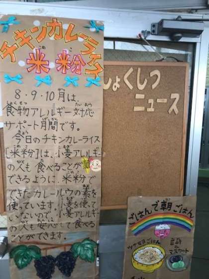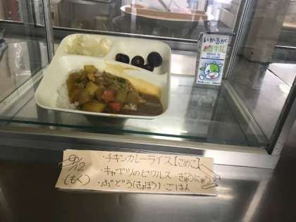 チキンカレーライス、キャベツのピクルス、牛乳、ブドウ(巨峰)
