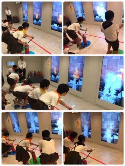 いよいよ阿倍野防災センターの中で、学習が始まりました。もしもに備えて何をするべきか学びました。続いて消火体験もしました。